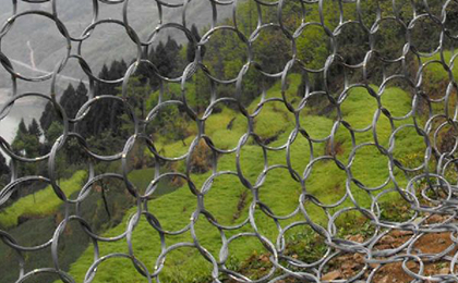 結構配置:鋼柱+支撐繩+拉錨繩+縫合繩+減壓環[鋼柱(間距10M),帶消能環的∮14雙支撐繩和∮16“1”字形上拉錨繩(每跨3個消能環),∮14側拉錨繩(單繩),◇/08/250/4*5㎡鋼絲繩網,∮8縫合繩,格柵網]